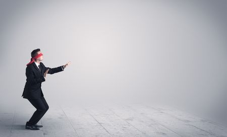 A young male business person in elegant dress standing with red blindfolds in a clear, empty space concept.
