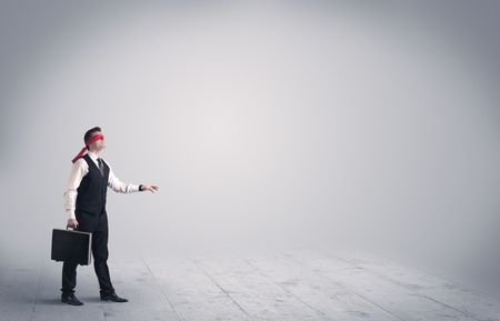 A young male business person in elegant dress standing with red blindfolds in a clear, empty space concept.
