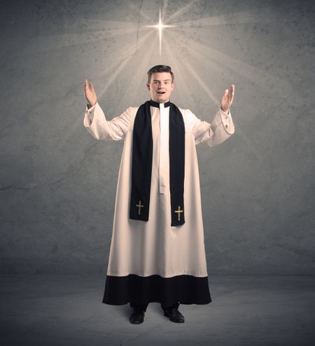 A young male priest in black and white giving his blessing in front of grey wall with glowing cross concept.