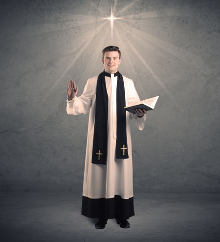 A young male priest in black and white giving his blessing in front of grey wall with glowing cross concept.