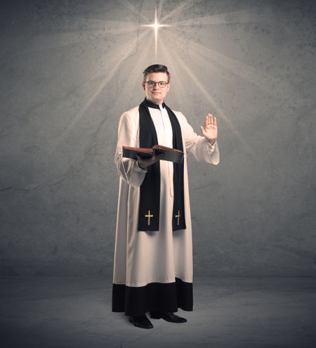 A young male priest in black and white giving his blessing in front of grey wall with glowing cross concept.