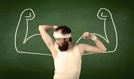 A young man with beard and glasses posing in front of green background, imagining how he would look like with big muscles, illustrated by minimalist white drawing concept.