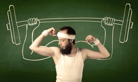 A young man with beard and glasses posing in front of green background, imagining how he would lift weight with big muscles, illustrated by white drawing concept.