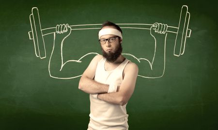 A young man with beard and glasses posing in front of green background, imagining how he would lift weight with big muscles, illustrated by white drawing concept.