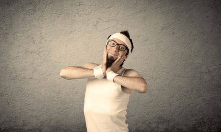 A young man with beard, headstrap and glasses posing in front of blank grey wall background, imagining he has big muscles