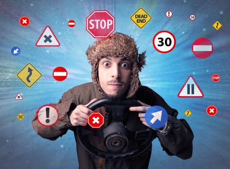 Young man holding black steering wheel with road signs surrounding him