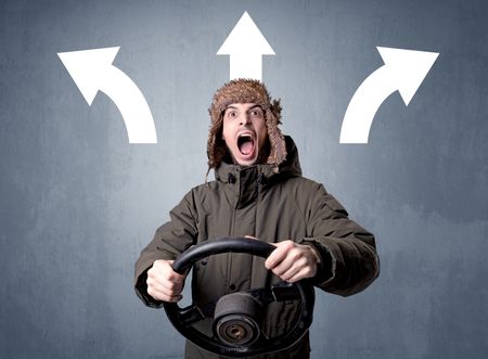 Young man holding black steering wheel with three arrows above his head pointing in different directions