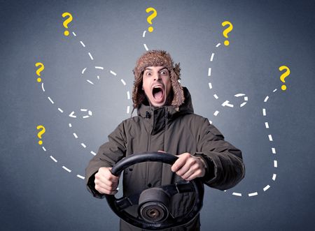 Young man holding black steering wheel with question marks around him