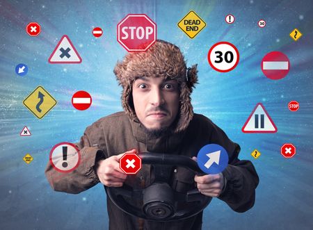 Young man holding black steering wheel with road signs surrounding him