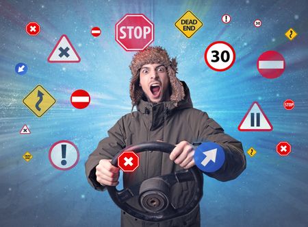 Young man holding black steering wheel with road signs surrounding him