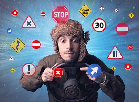 Young man holding black steering wheel with road signs surrounding him
