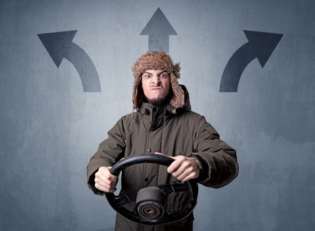 Young man holding black steering wheel with three arrows above his head pointing in different directions