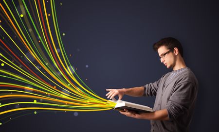 Young man reading a book while colorful lines are coming out of the book