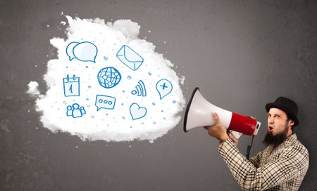Young man shouting into loudspeaker and modern blue icons and symbols come out