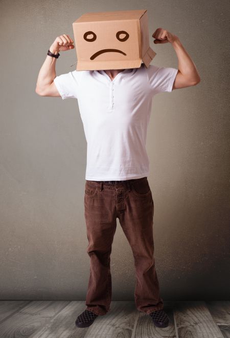 Young man standing with a brown cardboard box on his head with sad face