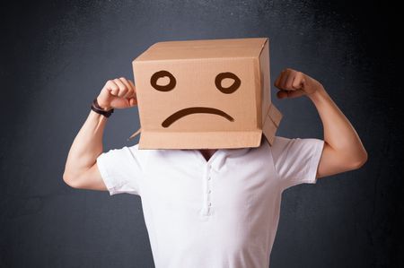 Young man standing with a brown cardboard box on his head with sad face