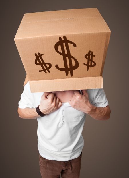 Young man standing and gesturing with a cardboard box on his head with dollar signs