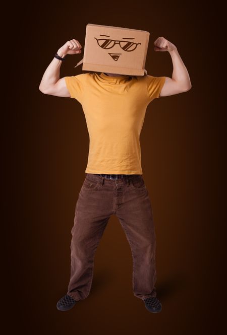 Young man standing and gesturing with a cardboard box on his head with smiley face