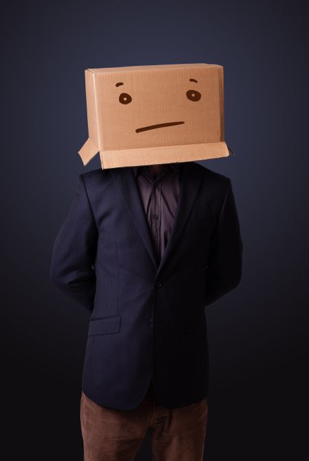 Young man standing and gesturing with a cardboard box on his head with straight face
