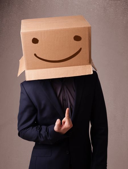 Young man standing and gesturing with a cardboard box on his head with smiley face
