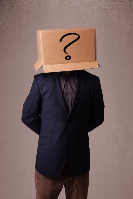 Young man standing and gesturing with a cardboard box on his head with question mark