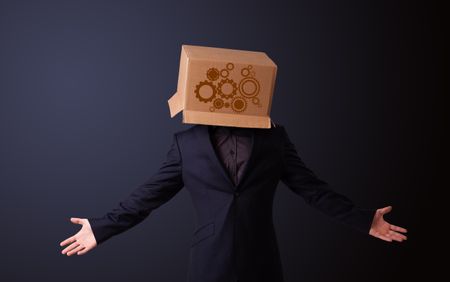 Young man standing and gesturing with a cardboard box on his head with spur wheels
