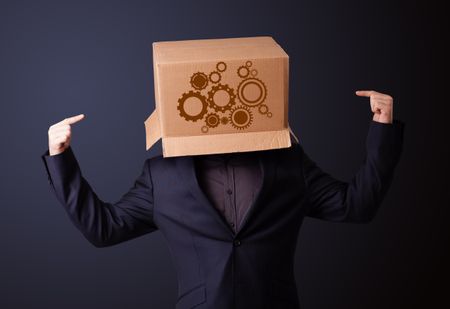 Young man standing and gesturing with a cardboard box on his head with spur wheels