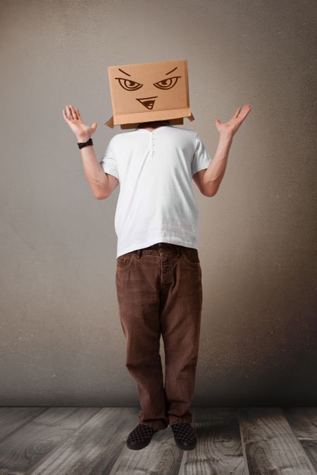Young man standing and gesturing with a cardboard box on his head with evil face