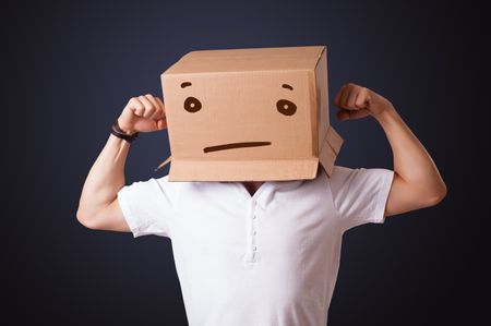 Young man standing and gesturing with a cardboard box on his head with straight face