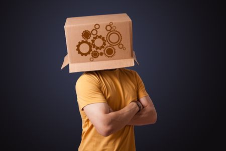 Young man standing and gesturing with a cardboard box on his head with spur wheels