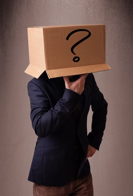 Young man standing and gesturing with a cardboard box on his head with question mark