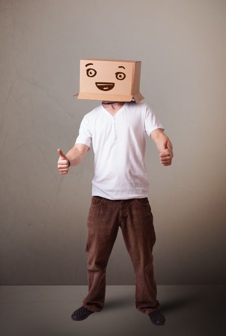 Young man standing and gesturing with a cardboard box on his head with smiley face