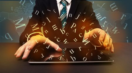 Young man in suit and formal clothing typing with letters around