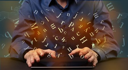 Young man in suit and formal clothing typing with letters around