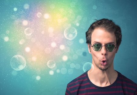 Young man with sunglasses and bokeh colourful lights concept