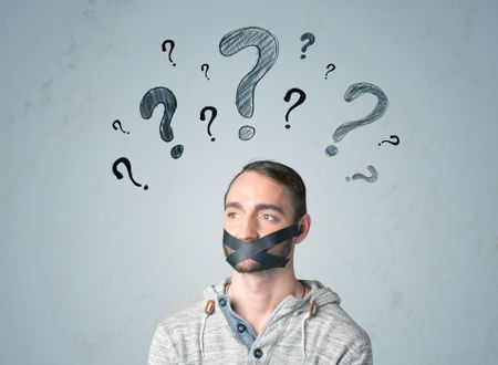 Young man with taped mouth and question mark symbols around his head