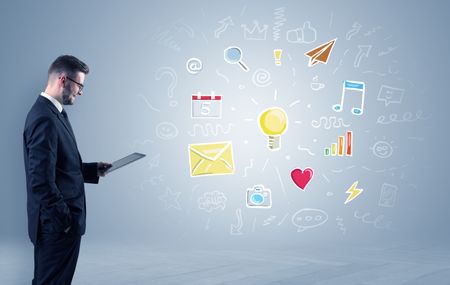 Young manager presenting new plan illustrated by colourful chalk drawn icons and symbols around