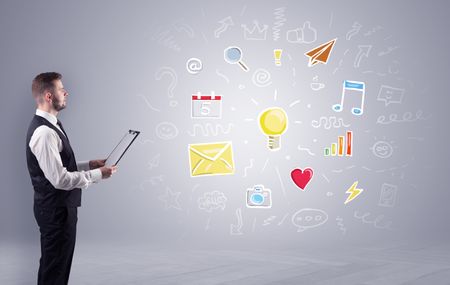 Young manager presenting new plan illustrated by colourful chalk drawn icons and symbols around