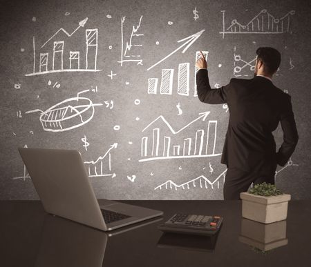 A young marketing office worker drawing pie chart and graph on wall at financial meeting concept