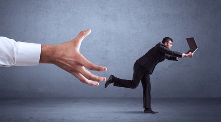 Young miniature businessman running from a big hand with blueish grey background