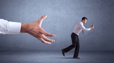 Young miniature businessman running from a big hand with blueish grey background