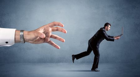 Young miniature businessman running from a big hand