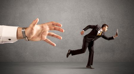 Young miniature businessman running from a big hand with light grey background