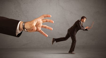 Young miniature businessman running from a big hand with grey background