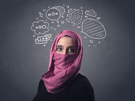 Young muslim woman wearing niqab with drawn speech bubbles above her head