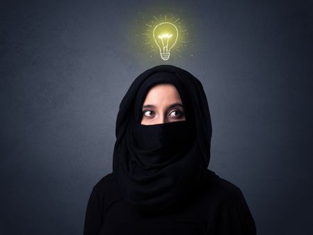 Young muslim woman wearing niqab with lit lightbulb above her head