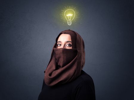 Young muslim woman wearing niqab with lit lightbulb above her head