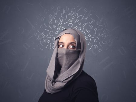 Young muslim woman wearing niqab with white alphabet letters above her head
