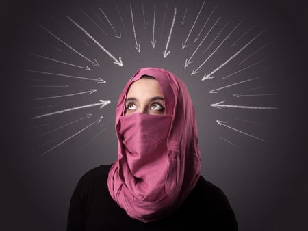 Young muslim woman wearing niqab with white arrows pointing to her head