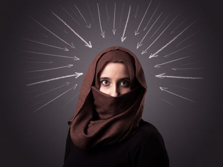 Young muslim woman wearing niqab with white arrows pointing to her head